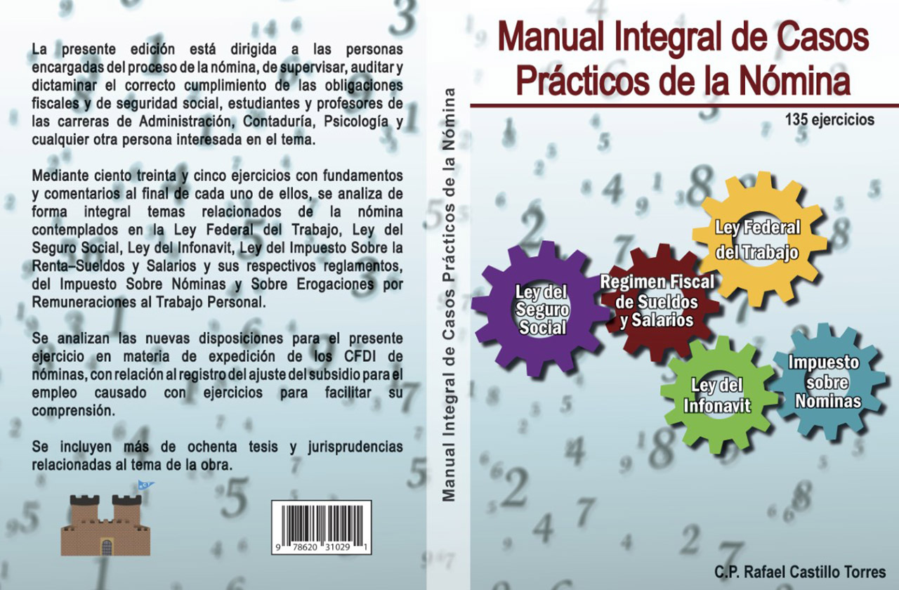 Mediante ciento treinta y tres ejercicios con fundamentos y comentarios al final de cada uno de ellos, se analiza de forma integral temas relacionados de la nómina contemplados en la Ley Federal del Trabajo, Ley del Seguro Social, Ley del Infonavit, Ley del Impuesto Sobre la Renta - Sueldos, Salarios y sus respectivos reglamentos, del Impuesto Sobre Nóminas y Sobre Erogaciones por Remuneraciones al Trabajo Personal.